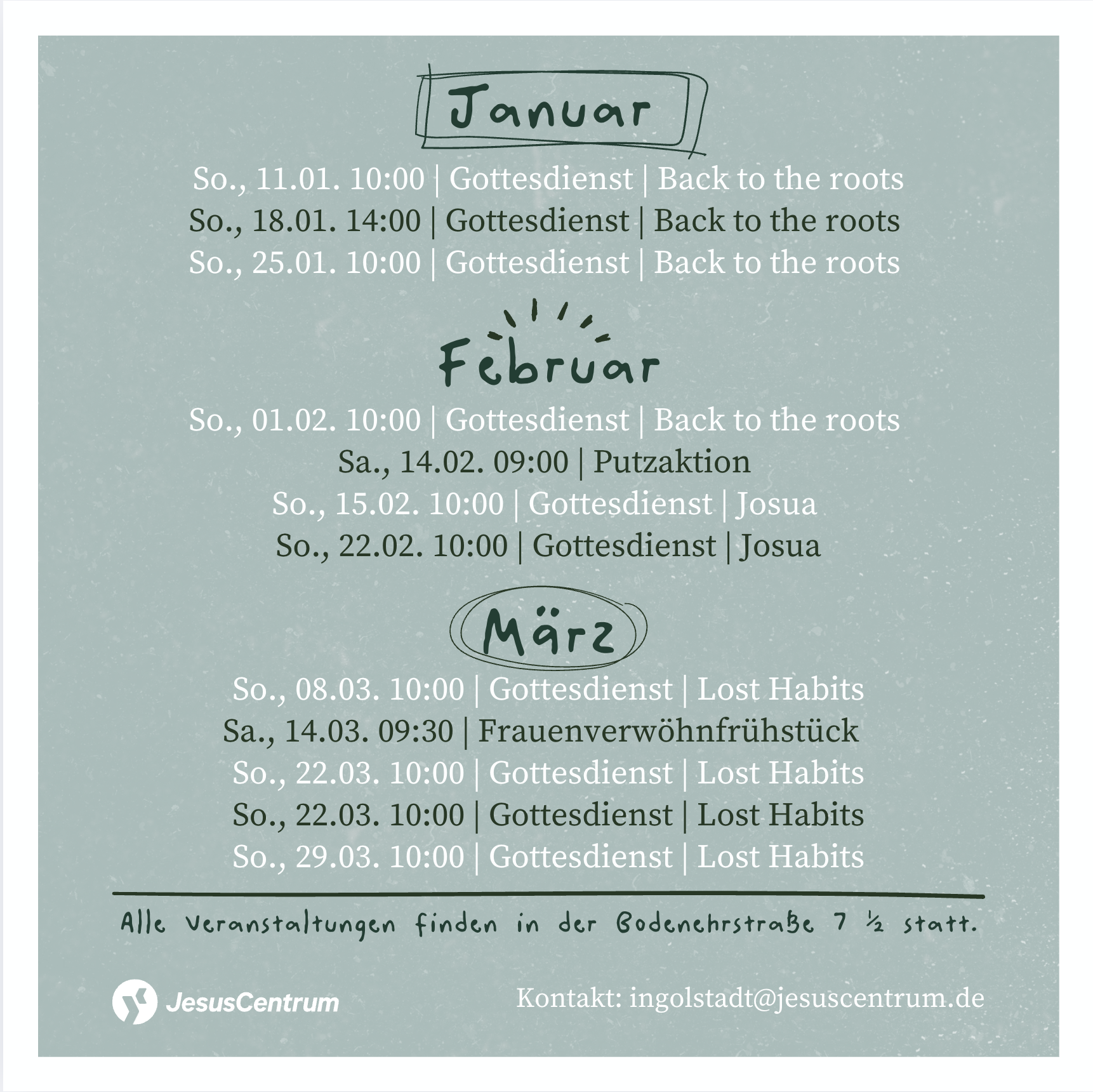 Hier findest du alle unsere aktuellen Termine auf einen Blick. Bei Fragen schreib uns gerne eine Mail an: ruwen.braun@jesuscentrum.de
